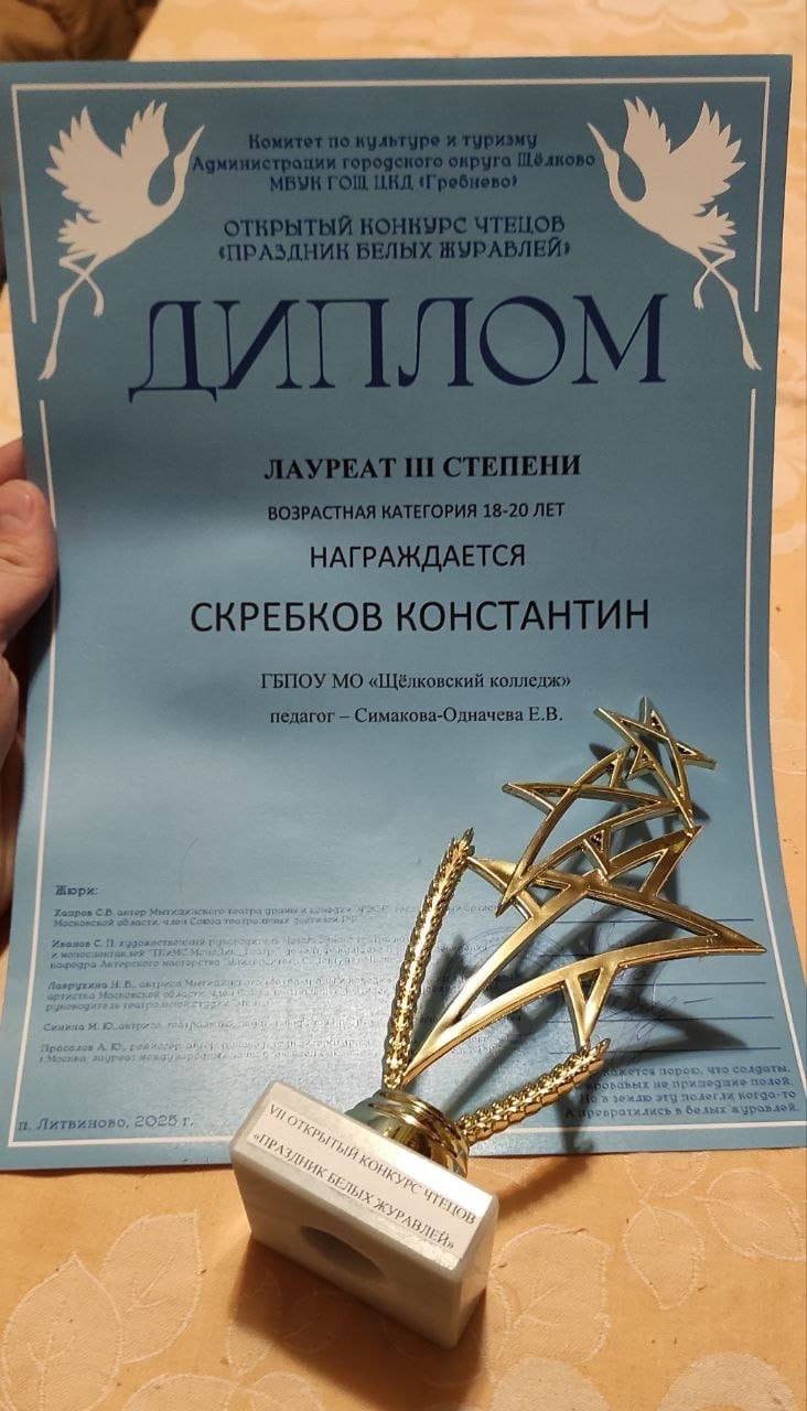 18 октября в Щелковском колледже состоялся VII Открытый конкурс чтецов «Праздник белых журавлей». Это масштабное событие собрало талантливых чтецов из разных уголков страны: Курска, Нового Уренгоя, Ивановской области, городов Подмосковья и многих других.