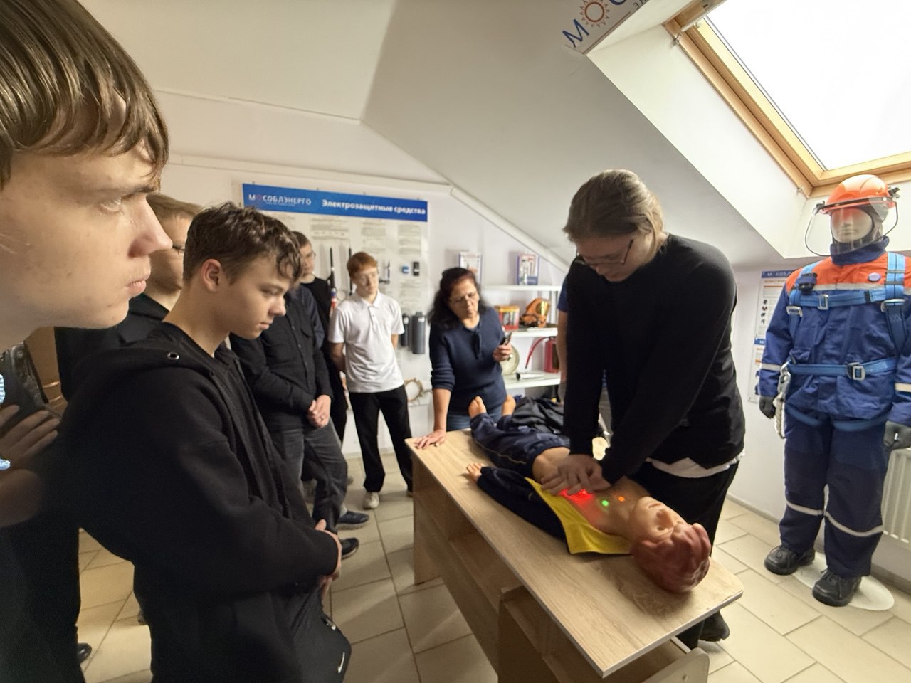 Но самым запоминающимся этапом экскурсии стал мастер-класс по оказанию первой помощи при поражении электрическим током! Специалисты на манекене-тренажере продемонстрировали правильный алгоритм действий: от освобождения пострадавшего от действия тока до проведения сердечно-легочной реанимации. И самое главное – каждый студент смог применить эти знания на практике и под руководством опытного наставника «оживить» манекен, отработав навыки, которые в критической ситуации могут спасти человеческую жизнь.