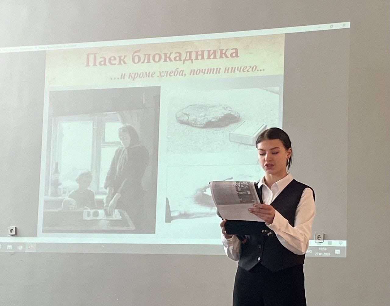 Мероприятие проведено с целью сохранения исторической памяти о событиях Великой Отечественной войны, подвиге жителей и защитников блокадного Ленинграда, формирования патриотизма. Ведущими мероприятия были студенты группы 5533 Грушина Дарья, Пелевина Анастасия, 5549 Никонорова Татиана.