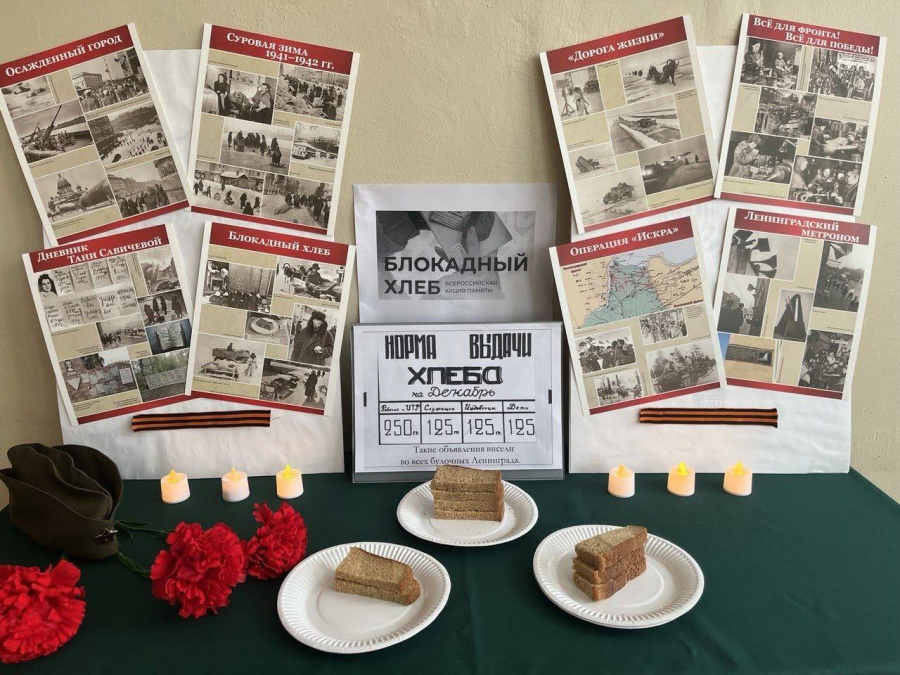 Символ акции памяти «Блокадный хлеб» стал небольшой кусочек хлеба весом 125 грамм — именно такой была минимальная норма выдачи хлеба в Ленинграде в самый трудный период блокады — зимой 1941–1942 гг.В рамках акции студенты получили блокадную карточку на хлеб , по которой они получили символический кусочек хлеба и карточки с информацией о различных фактах того времени.
