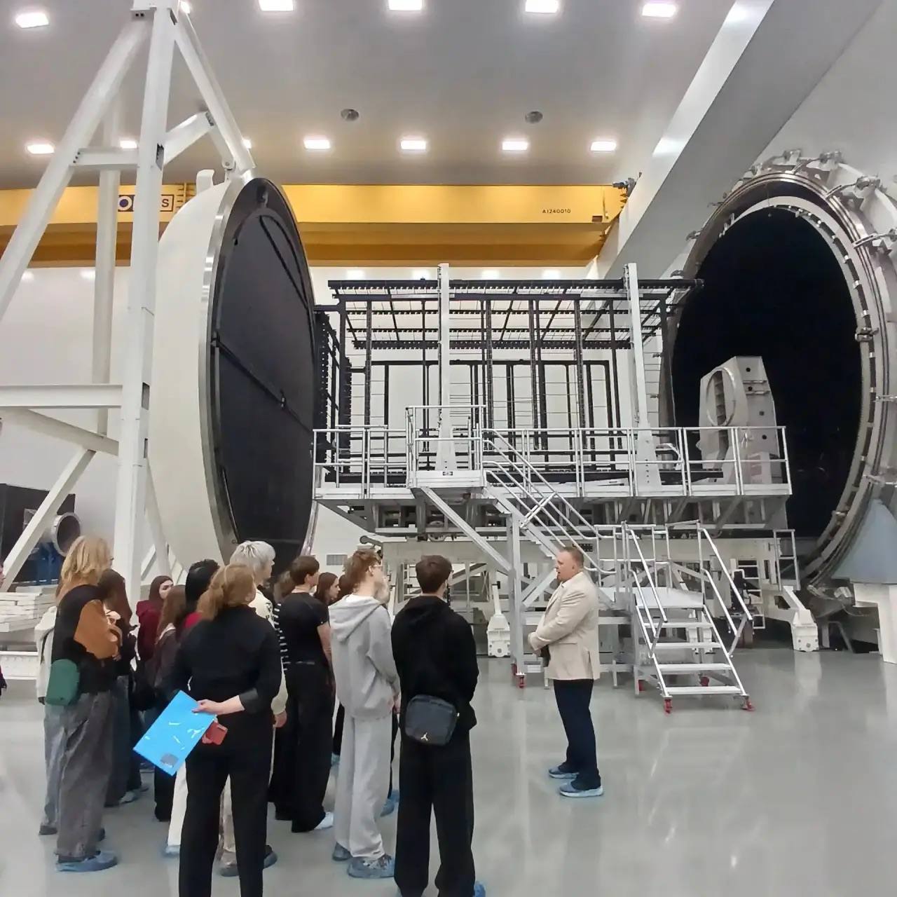Начал экскурсию Юдин Виталий Александрович, заместитель главного инженера - начальник отдела сборки. Студенты узнали о том, как происходит сборка космического аппарата и какие испытания проходит КА (камера невесомости, акустическая камера). Ребята смогли увидеть макет малого спутника, который контролирует растекание метана, увидели стенд для испытаний спутника в момент транспортировки. Далее студенты посмотрели видео, в котором наглядно было показано все - от сборки КА до доставки на космодром.