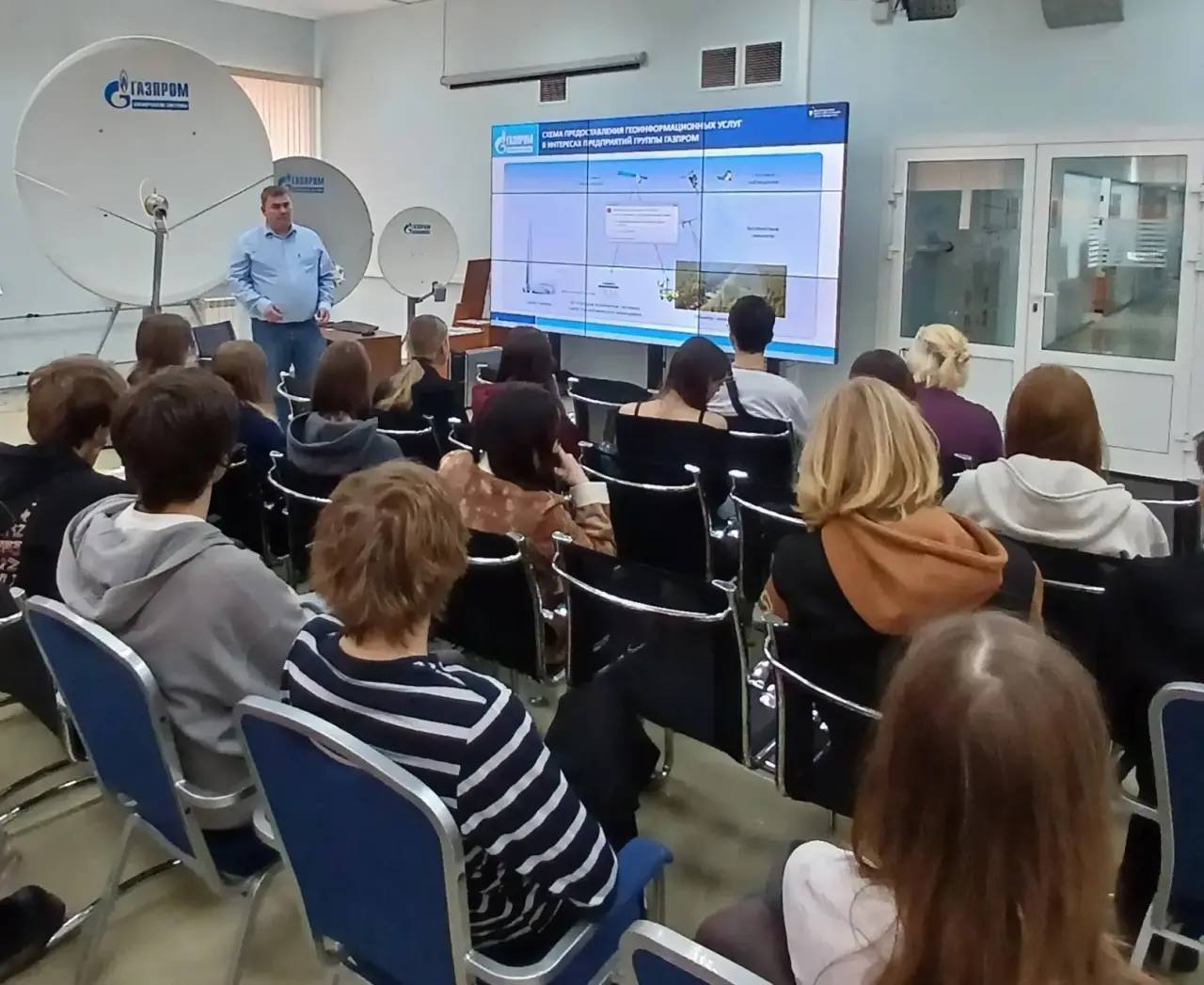 Продолжил экскурсию Вахтанов Андрей Сергеевич - начальник управления геоинформационных услуг. Он рассказал студентам о некоторых направлениях, которыми занимается АО "Газпром космические системы": аэрокосмический мониторинг, спутниковая связь и вещание, разработка и интеграция космических систем.