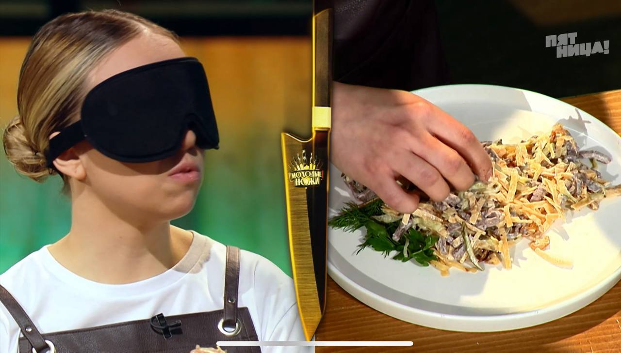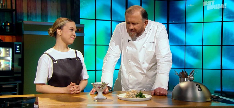 Первое задание проверяет то, как участник повторяет классические блюда. Валерии было необходимо вслепую угадать блюдо советской кухни - под крышкой баранчика скрывался салат "Министерский" . Его и нужно было воссоздать по вкусу и подобию того, что приготовил знаменитый шеф!